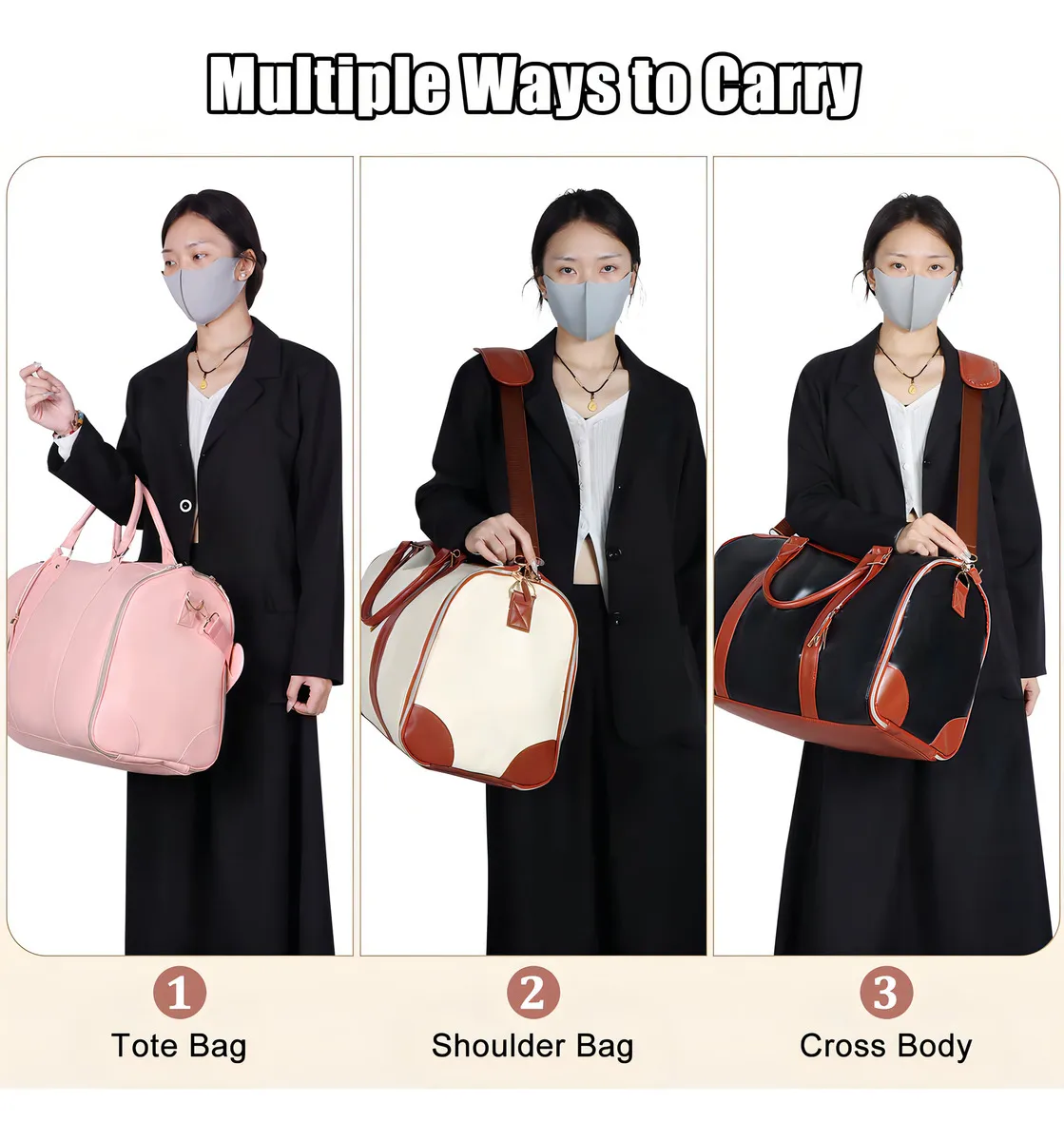 Elegante en cuero ecológico (beige, rosa o negro), con asa y correa cruzada. ¡El imprescindible para viajeros inteligentes como tú!