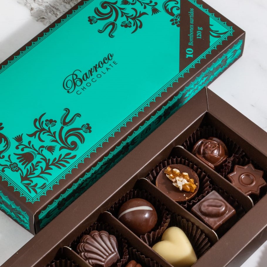 Caja para regalo con 10 bombones de sabores surtidos, elaborados únicamente con chocolates nobles o puros, presentada en una caja hecha a la medida con un diseño de estilo barroco.