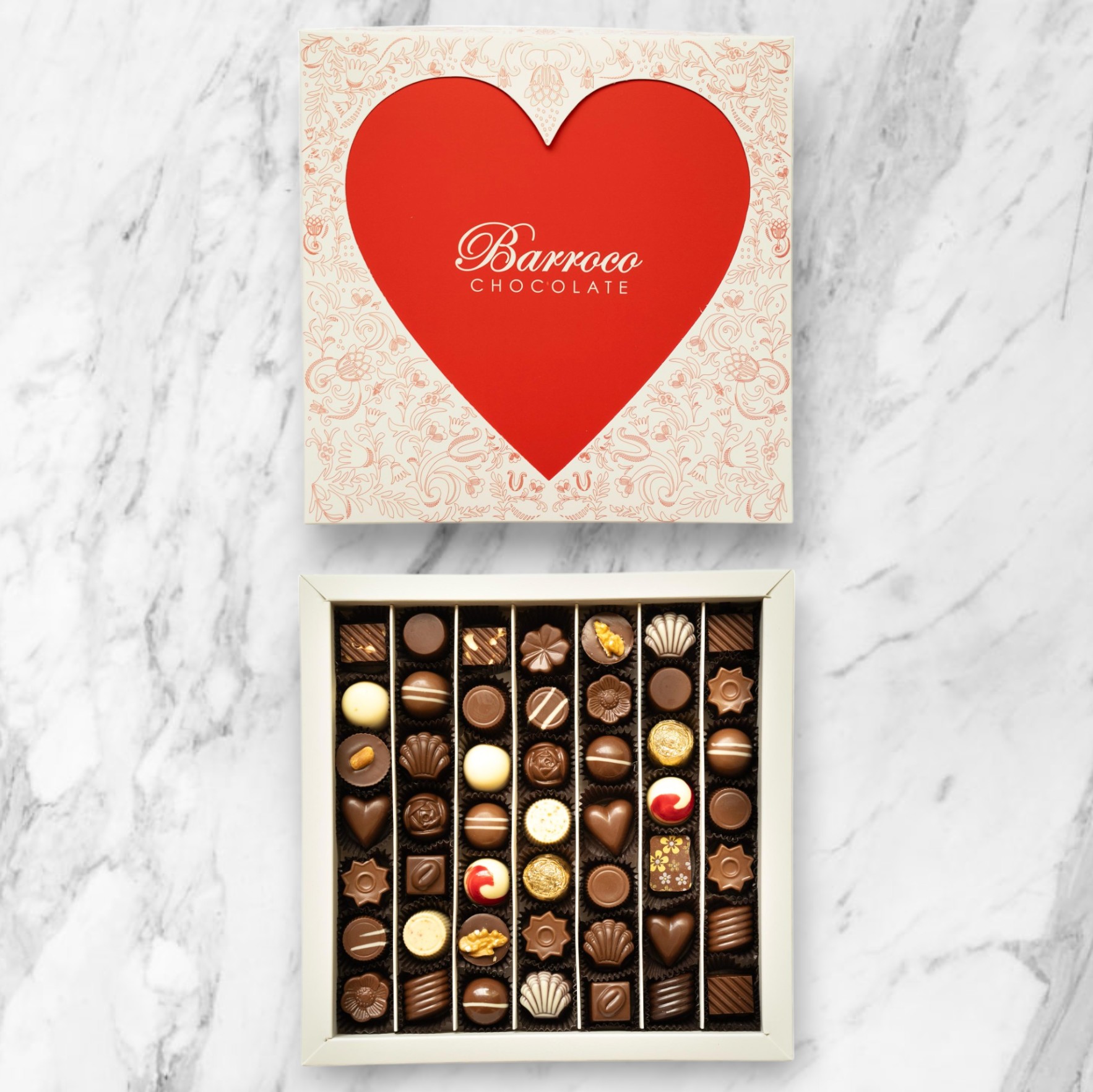 Esta elegante caja adornada con un delicado diseño barroco y un hermoso corazón en la tapa, resguarda en su interior 49 exquisitos bombones surtidos, elaborados con chocolates nobles o puros de origen belga. Un gesto de amor y sofisticación en cada detalle.