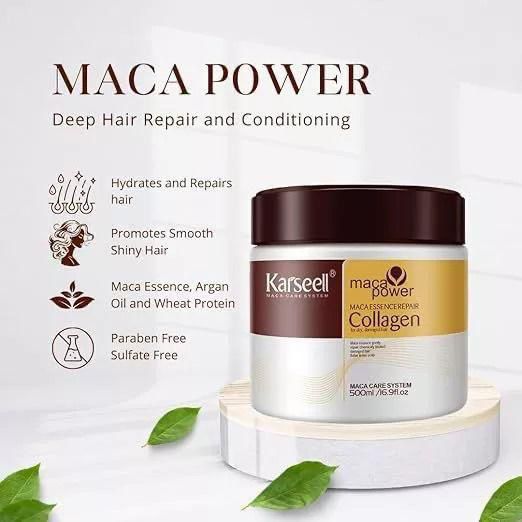 Recupera la vitalidad de tu cabello con la Máscara Capilar Karseell Maca Essence Repair Collagen. Enriquecida con maca, colágeno activo y aceite de argán marroquí, repara las fibras capilares y rellena cavidades desde el interior. Ideal para cabello seco y dañado, proporciona hidratación, suavidad y brillo duradero. Con 500 ml, es perfecta para un tratamiento intensivo de calidad profesional. ¡Devuélvele la vida a tu melena!