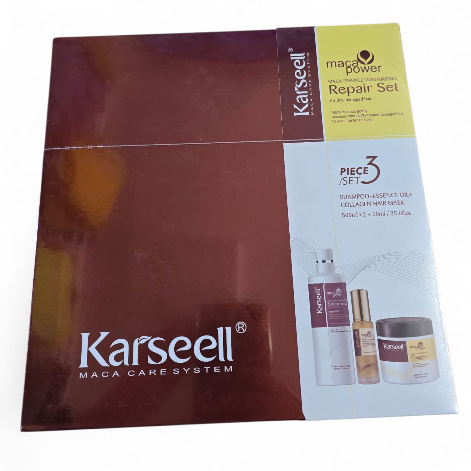 Recuperá la belleza natural de tu cabello con el Kit Reparador Karseell, un tratamiento profesional que incluye shampoo, crema y aceite, diseñado para reparar, nutrir e hidratar profundamente el cabello dañado desde la raíz hasta las puntas.