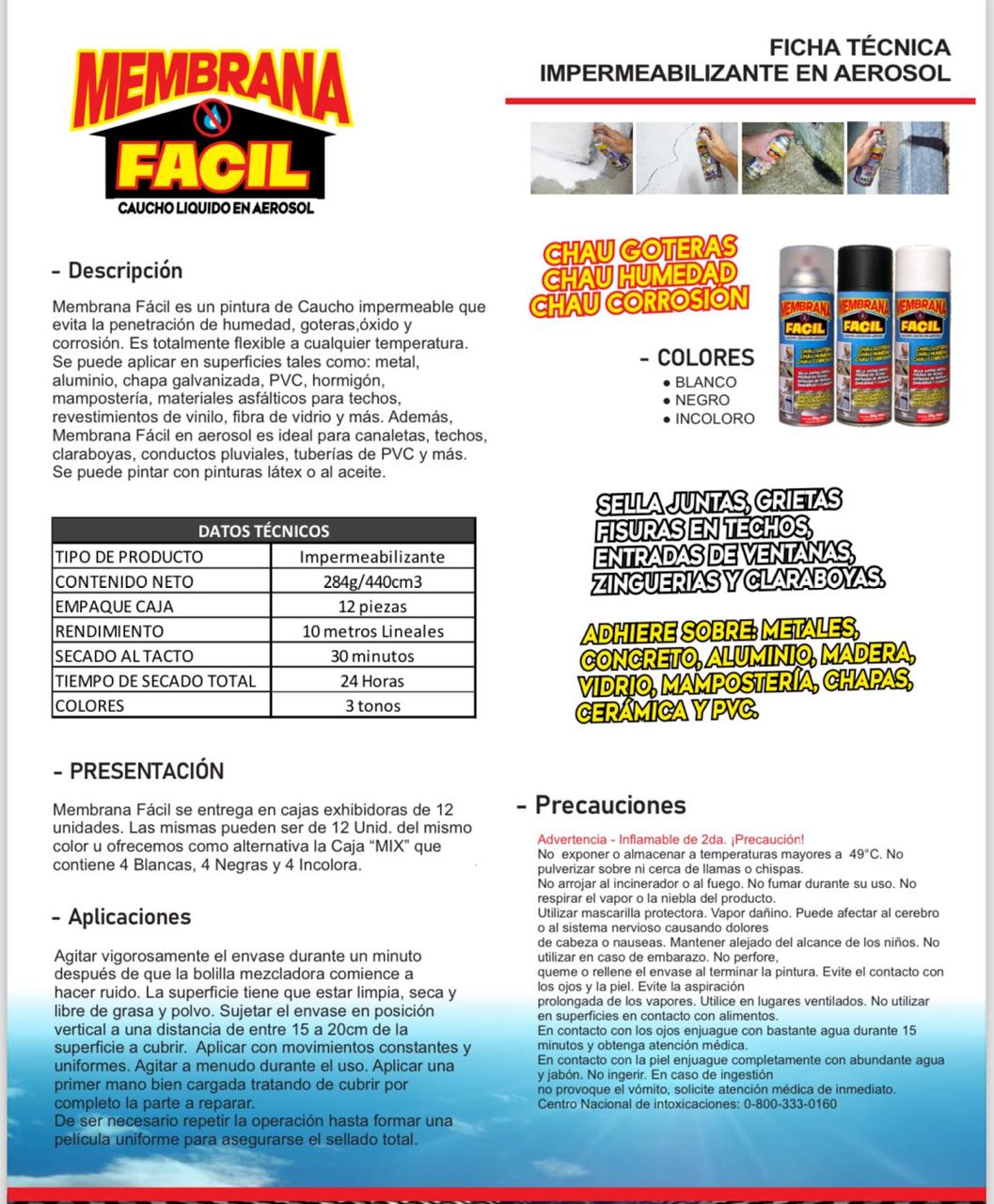 Además de su función impermeabilizante, la Membrana Fácil en aerosol también ayuda a prolongar la vida útil de las superficies tratadas, evitando daños por humedad y reduciendo gastos de mantenimiento.